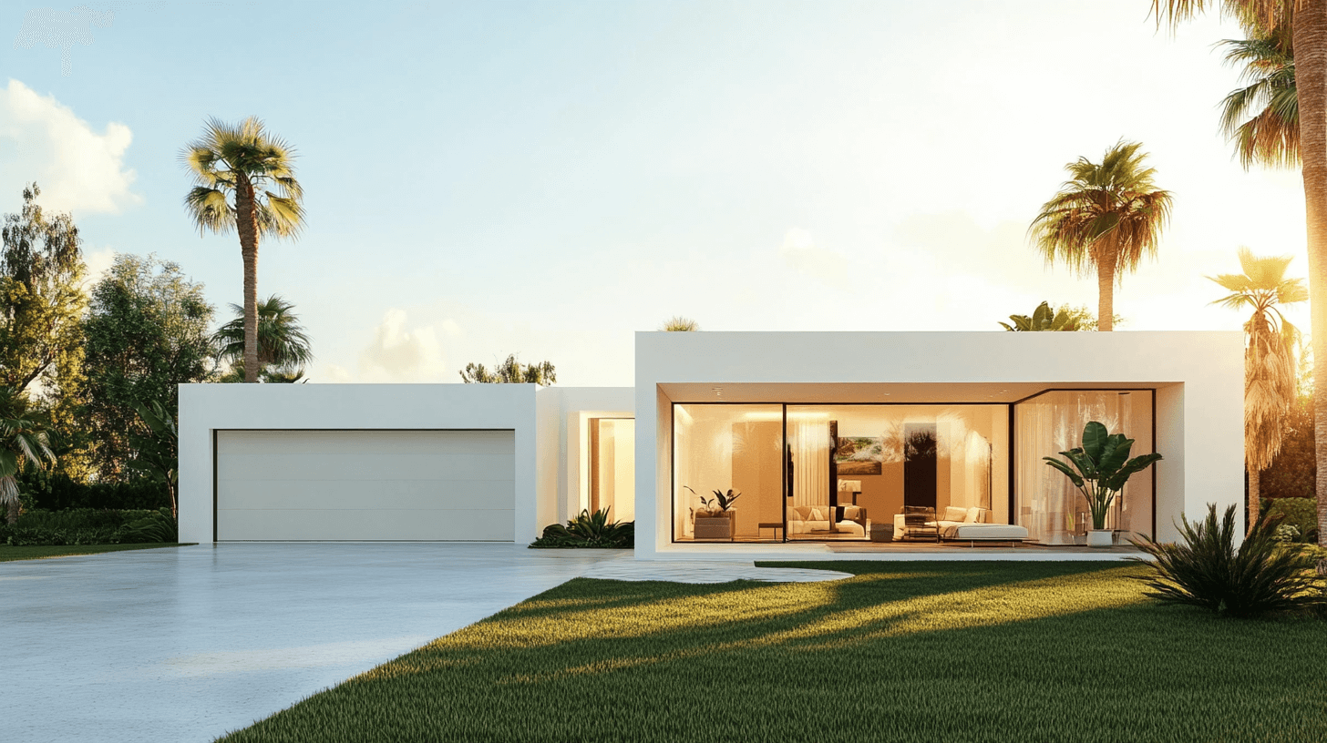 Modern exterior design with white stone facade, integrated lighting and a tropical front yard with palm trees.